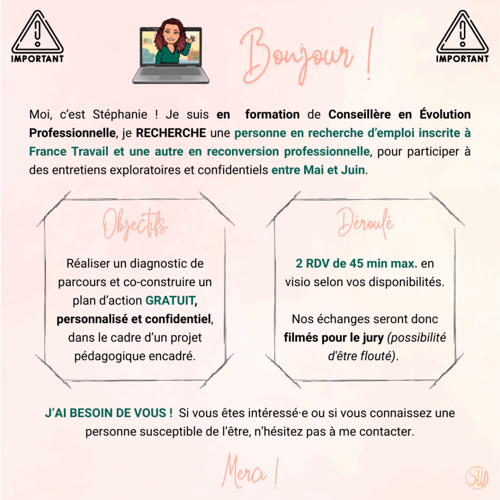 Voici le projet 4, fictif, réalisé grâce à la participation de deux bénéficiaires, une en quête d’une reconversion professionnelle et l’autre en recherche d’emploi. Ce projet a été validé durant ma formation de Conseillère emploi et accompagnement professionnel dont j’ai obtenu la certification en Juillet 2025.